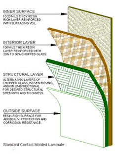 Our "STANDARD" resin system consists of Premium grade Vinyl ester resin in both the Inner Surface and Interior Layer. Isophthalic polyester resin is used in the Structural Layer and Outside Surface.